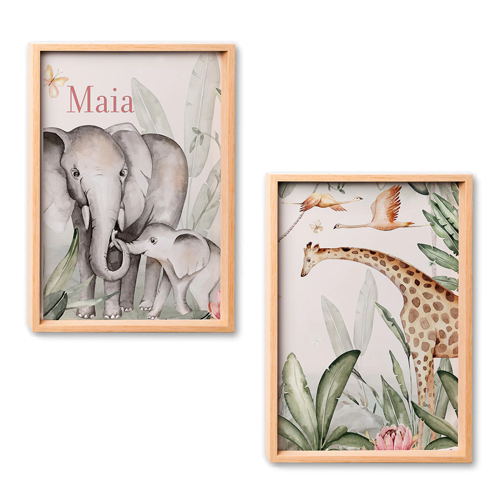 * 2 cuadros de 20x30cm con marco de madera - Uno con nombre pesonalizado y el otro con diseño Tori (El diseño del segundo cuadro es referencial, y varía según el nombre que elijas)