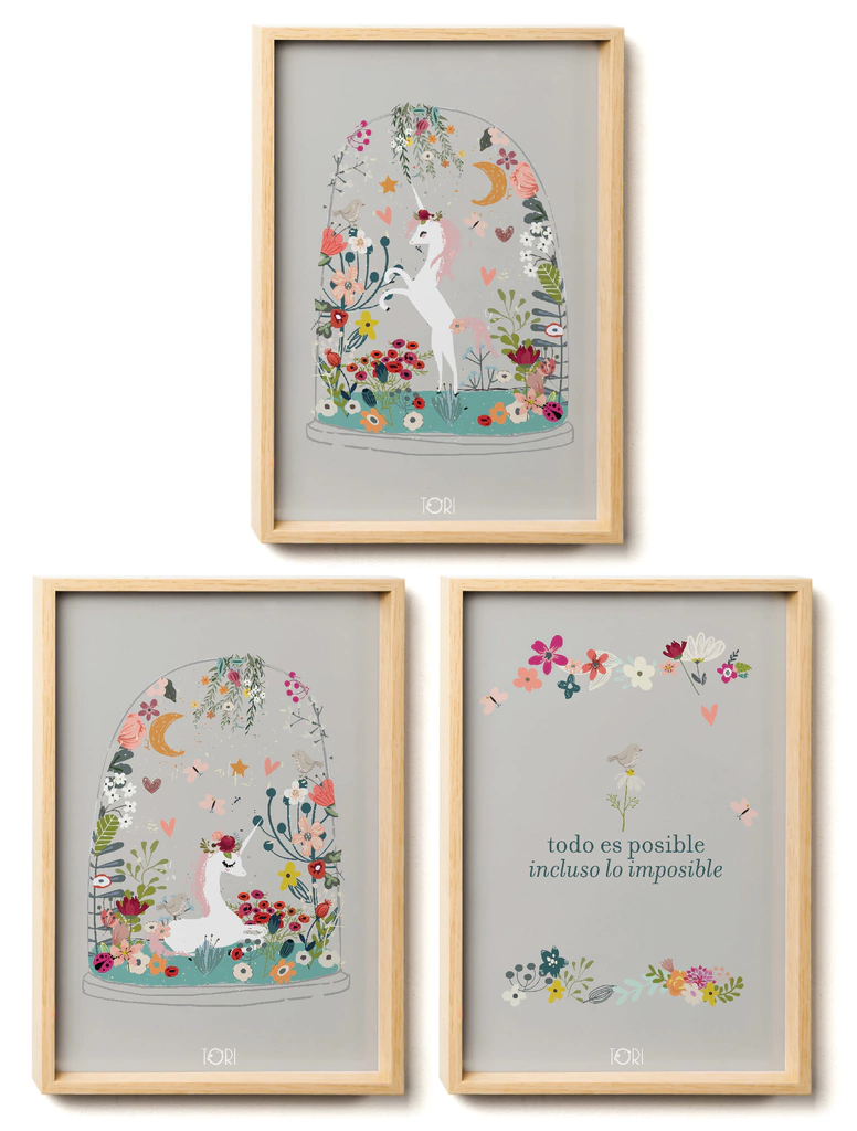 - Cuadros: lámina de 20x30cm impresa en papel ilustración mate de 300 gr, con marco de madera y vidrio de 2 mm.